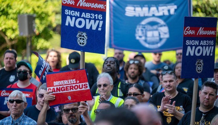 The International Brotherhood of Teamsters said this week that “Teamsters, thousands of labor allies, California elected officials, and public safety officials rallied and marched to the State Capitol” on Tuesday to demand Newsom sign the bill into law.