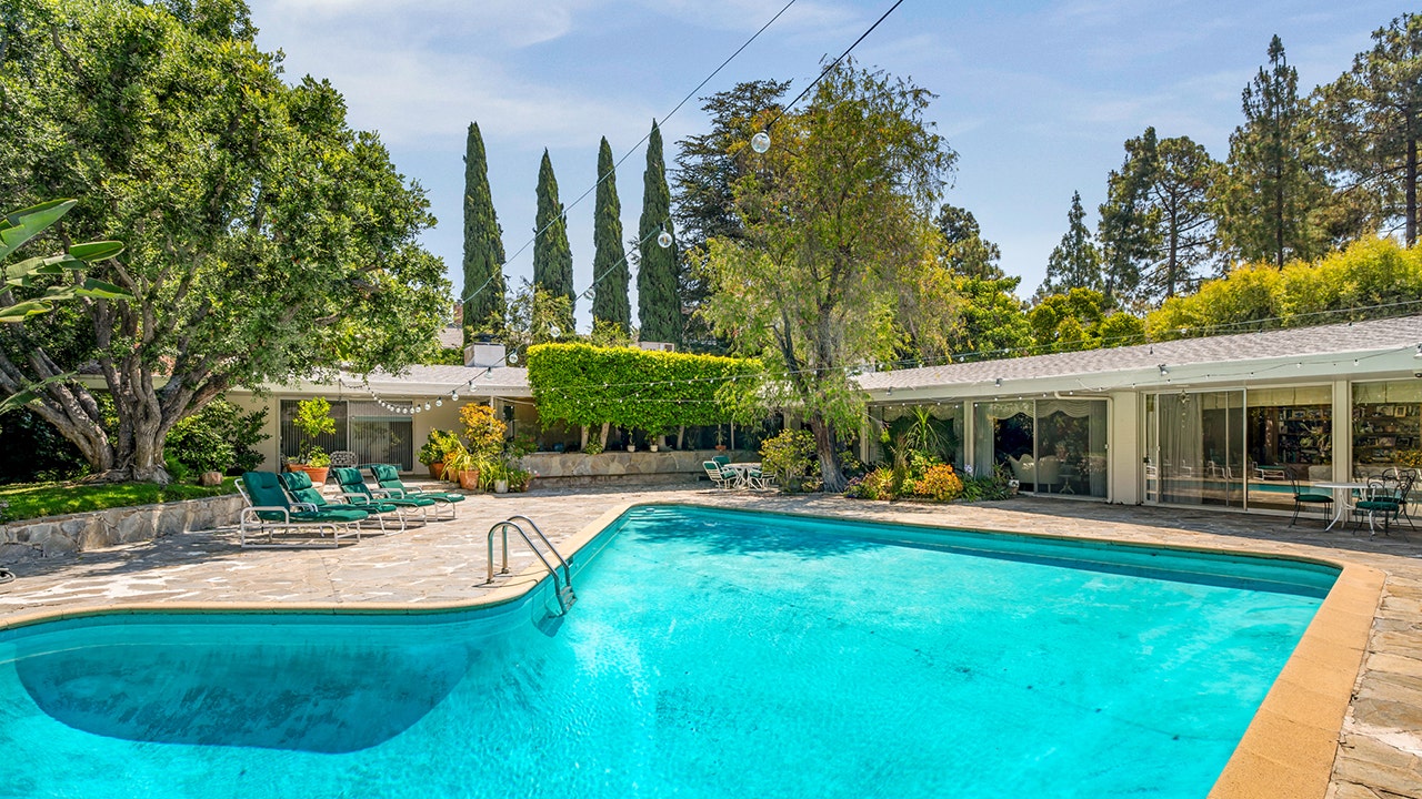 The backyard of the property also has a distinctive pool with trees surrounding the area for privacy.