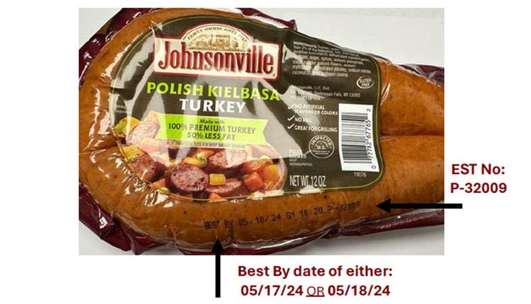 The FSIS specified the potentially-contaminated products included 12-ounce Johnsonville Polish Kielbasa Turkey Sausage packages with May 17 and May 18 “best by” dates and a “P-32009” establishment number.
