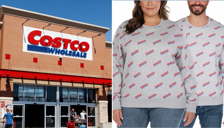 The gray, cotton and polyester sweatshirt, available for only $12.97, is covered in the recognizable red and blue Costco logo.