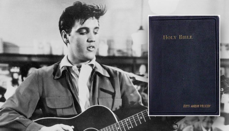 The bible up for auction features the musician’s full name, Elvis Aaron Presley, embossed in gold. Presley seemingly highlighted portions of scripture that spoke to him, including a passage from the book of Job: