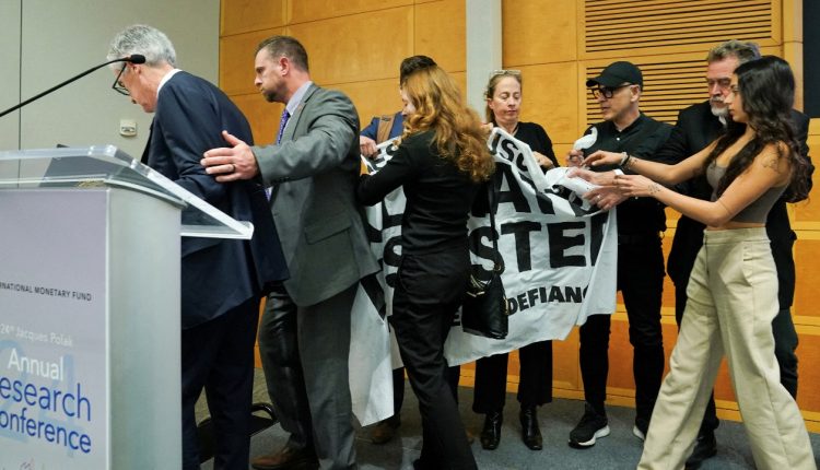This is the second time in a month that the group has interrupted an event attended by Powell. Climate protesters also forced Powell to be escorted off of the stage three weeks ago when he was about to deliver comments on the U.S. economy at an event in New York.