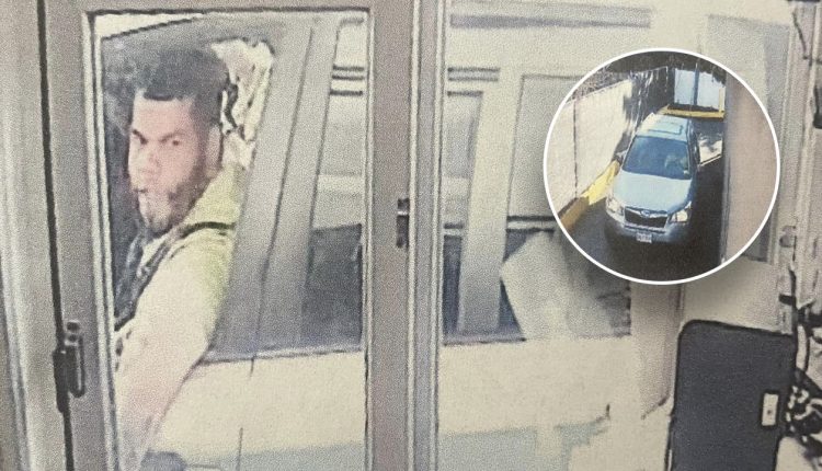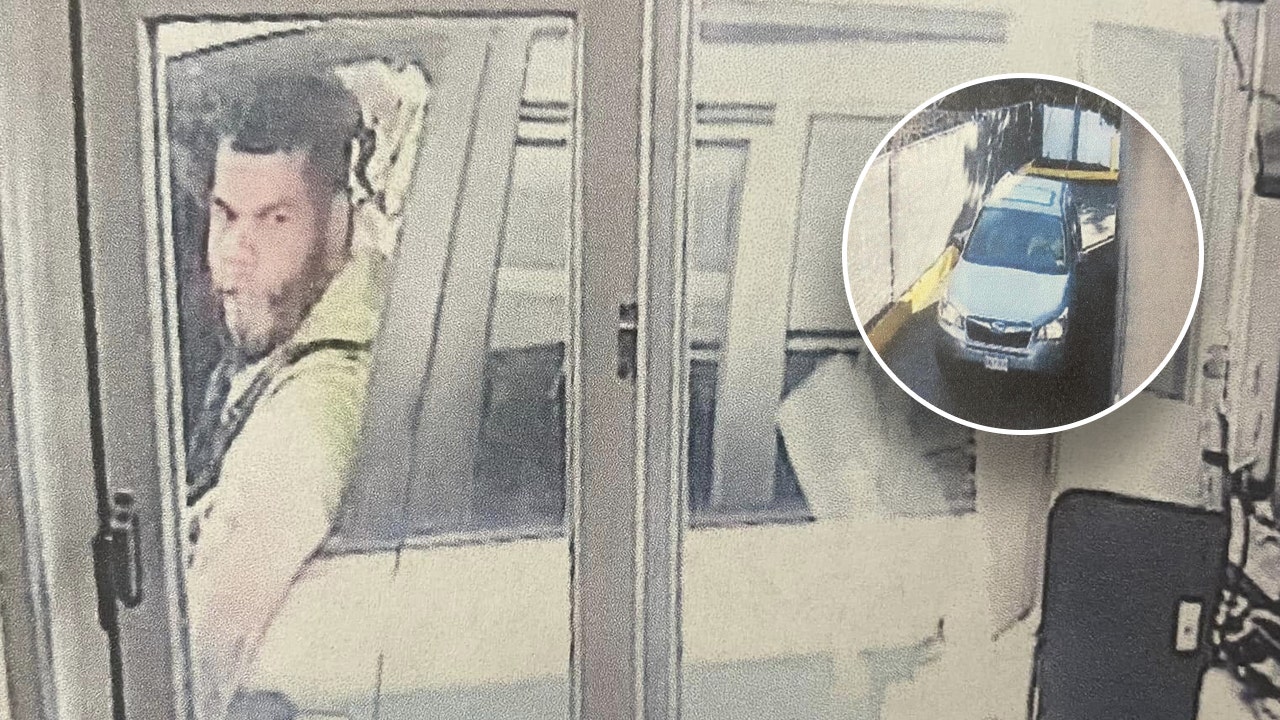 The suspect appears to be driving a silver four-door SUV. He has short dark hair, a beard, mustache, and a soul patch under his lip.