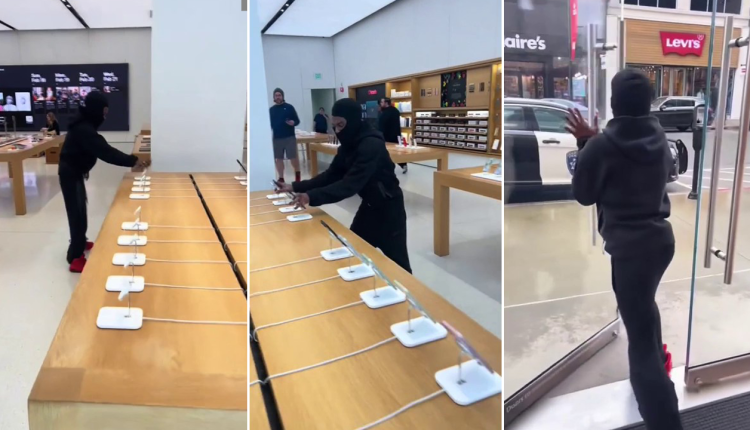 A thief in California committed a brazen, daytime robbery at an Apple Store before walking past a police vehicle and into a getaway car, video shows.