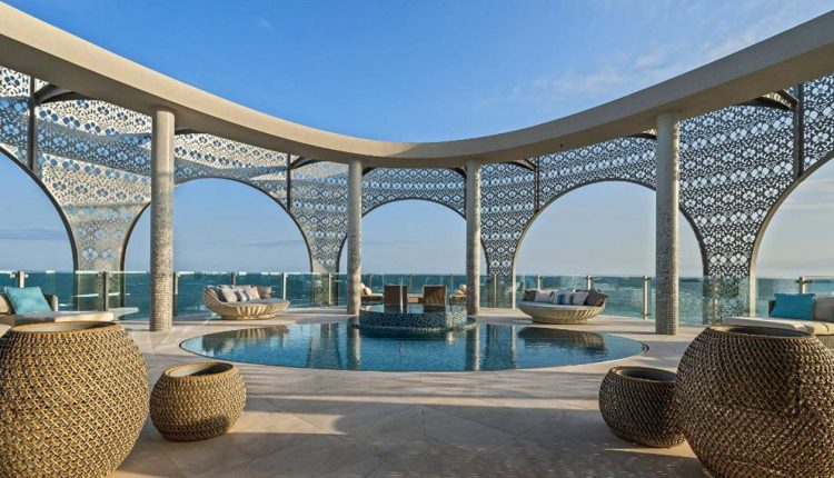 The top floor penthouse included an outdoor pool with wicker lounge seats that could hold multiple people each, a hot top that overflows into the pool, and archways peeking out across the ocean.