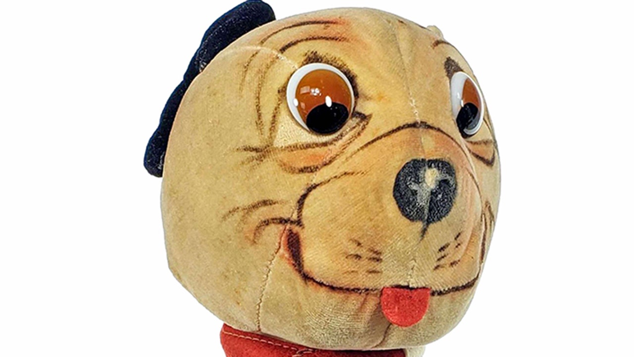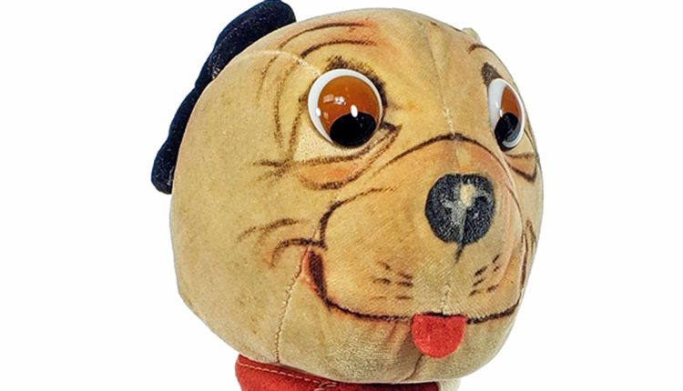 This particular plush dog up for sale is 10½ inches long. It’s velvet, has glass eyes, a black velvet ear, a red felt tongue, jointed limbs and a swivel head, according to EJ’s.