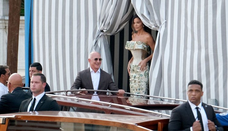 Photos captured the billionaire Amazon founder and his fiancee dressed to the nines while exiting a hotel on Venice’s famed Grand Canal to make their way onto a waiting water taxi.