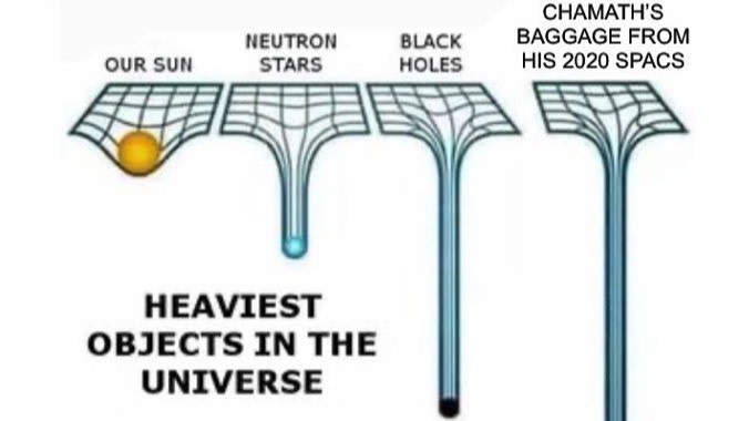 According to Palihapitiya, if the sponsor promote rubs you the wrong way, “you can never claim it wasn’t disclosed.” This is a peculiar way of endorsing the Spac model. He’s openly admitting the flaws — even as he’s reminding you that if you lose money, that’s on you.