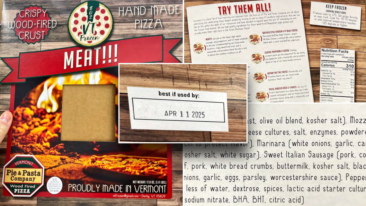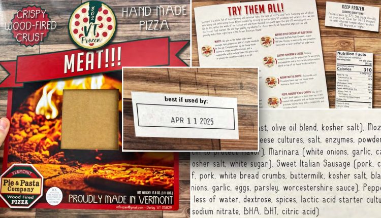 The “802 VT Frozen MEAT!!! CRISPY WOOD-FIRED CRUST HAND MADE PIZZA” packaging fails to mention that the product contains soy.