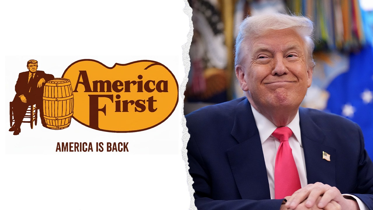 Where the logo normally reads “Cracker Barrel,” the spoof replaced it with “America First,” with “AMERICA IS BACK” underneath.