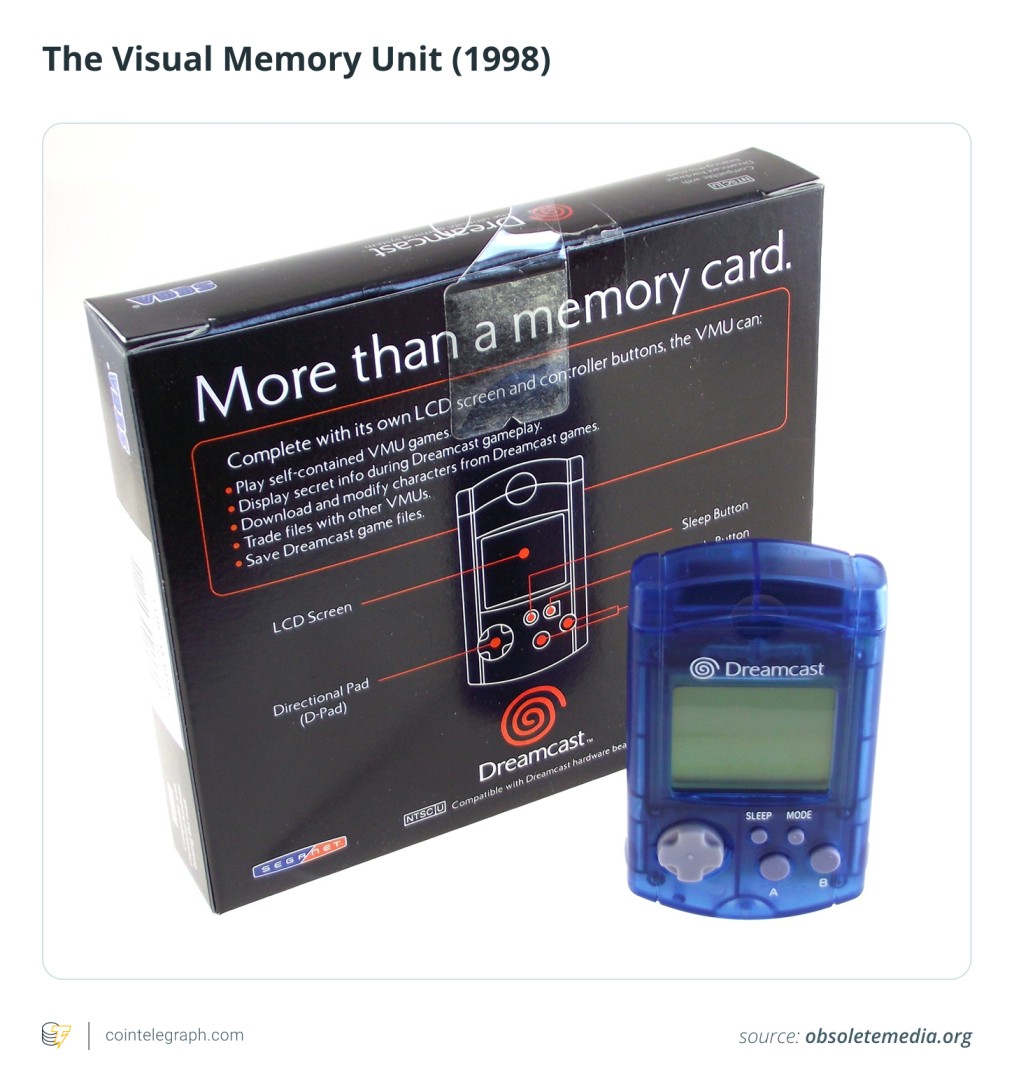 The Visual Memory Unit (1998) was Sega’s quirky add-on for the Dreamcast: a memory card with a tiny screen that could show in-game stats or play minigames. It was fun but limited, battery-hungry, low on memory and largely ignored by developers.