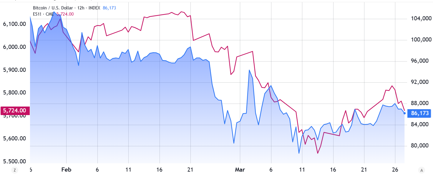 Some analysts attribute Bitcoin’s weak performance to the ongoing global tariff war and US government spending cuts, which increase the risk of an economic recession. Traders worry about slower growth, particularly in the artificial intelligence sector, which had driven the S&P 500 to a record high on Feb. 19 before falling 7%.