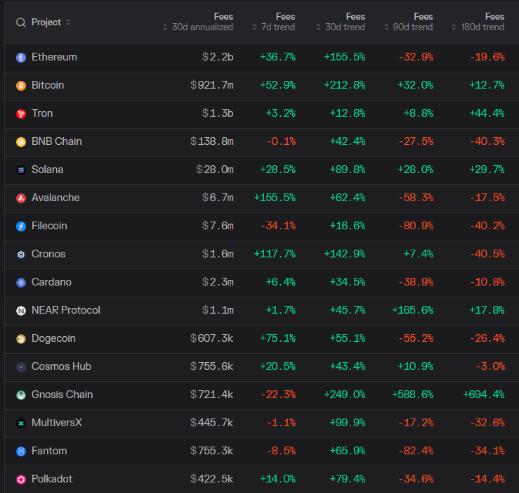 When layer-1 fees are rising, it suggests that there is increasing interest in DeFi and that traders are utilizing DApps to interact with blockchains. In the past 30-days, the top 16 layer-1 blockchains by market cap all have shown a positive increase in fees. The 30-day fee total collected by Ether (ETH) is over $2.2 billion when annualized.