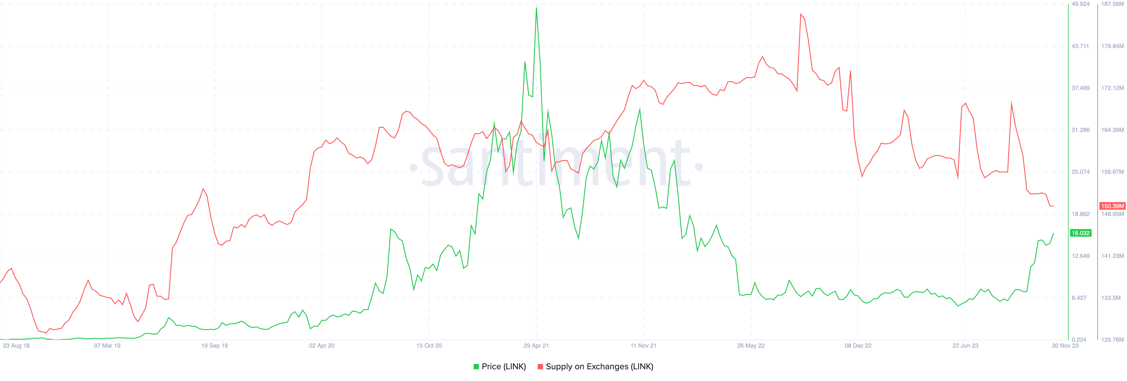 More clues about Chainlink’s potential 20% rally in December 2023 come from data tracking LINK supply across crypto exchanges (the red wave in the chart below).