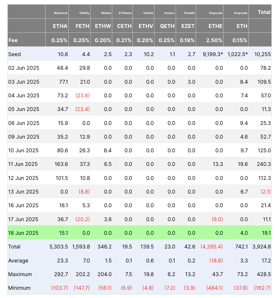 Spot Ether ETFs saw a 19-day inflow streak before it broke on June 13, but rebounded with three consecutive days of fresh inflows between June 16-18, including over $19 million on Wednesday. These investment products have seen net inflows totaling $861.3 million over the last two weeks, as per data from Farside Investors.