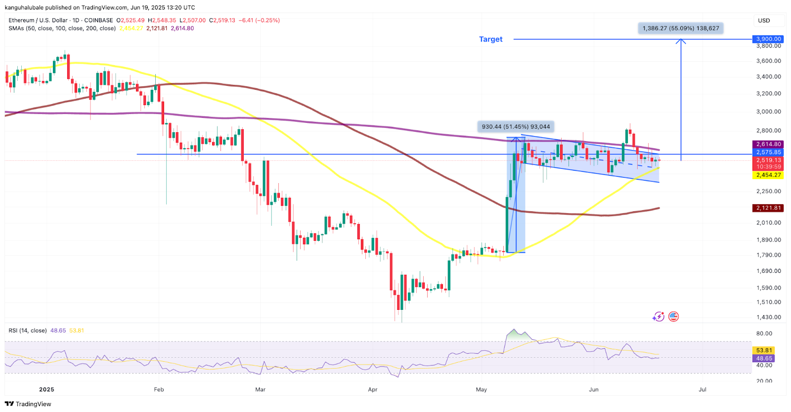 The bull flag pattern, on the other hand, indicates a potential breakout toward $3,900, as shown in the chart below.
