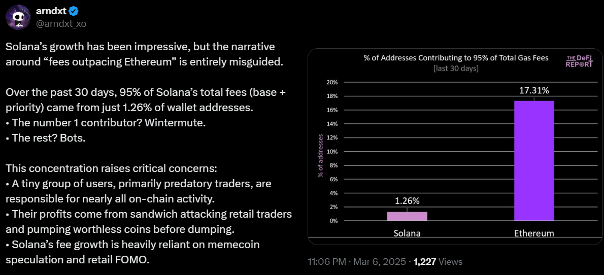 For some critics, the potential for increased activity on the Solana network is less of a concern. They argue that the narrative surrounding Solana is misleading, as reportedly 95% of the network’s fees came from just 1.3% of users, mainly driven by Wintermute, a market-making firm, and maximum extractable value (MEV) bots.