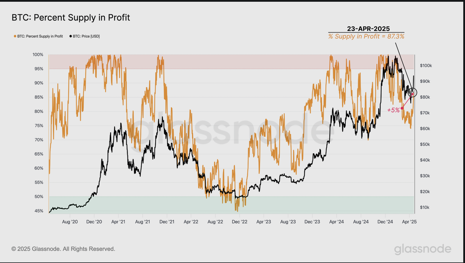 As of April 23, 87.3% of Bitcoin’s circulating supply was in profit, up from 82.7% when BTC last traded near $94,000 in early March, according to Glassnode data.