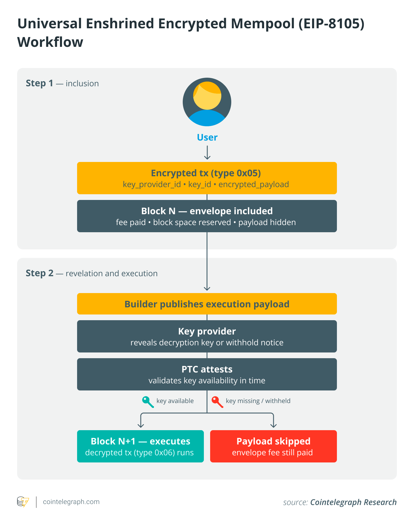 Universal Enshrined Encrypted Mempool, also known as EIP-8105, is a scheme-agnostic encrypted mempool design, which means it can support a wide range of encryption methods, including threshold encryption, MPC committees, TEEs, delay encryption, and fully homomorphic encryption. A new system contract on the execution layer, called the key provider registry, is planned to facilitate this flexible design. It would allow any account to register as a key provider that holds and reveals decryption keys using their own preferred encryption technology.