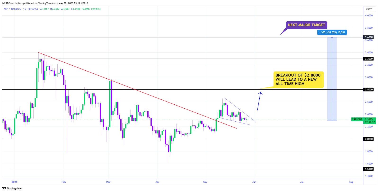 “$XRP closed indecisively and is still maintaining a falling wedge formation,” the trader wrote in a May 28 post on X, adding: