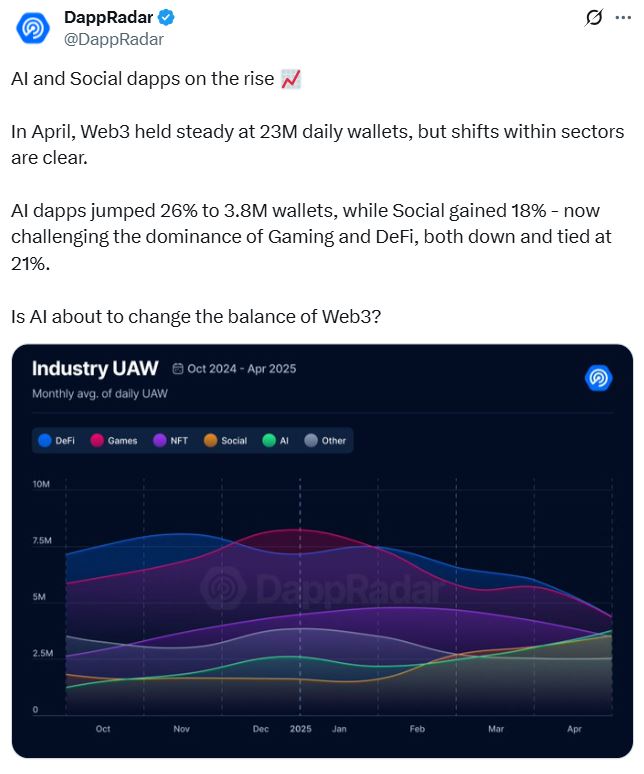 Gaming and DeFi are both sitting on 21% dominance in April, judged by percentage of unique active wallets, while AI has climbed to 16%, up from the 11% recorded in the February report, data in DappRadar’s April industry report shows.