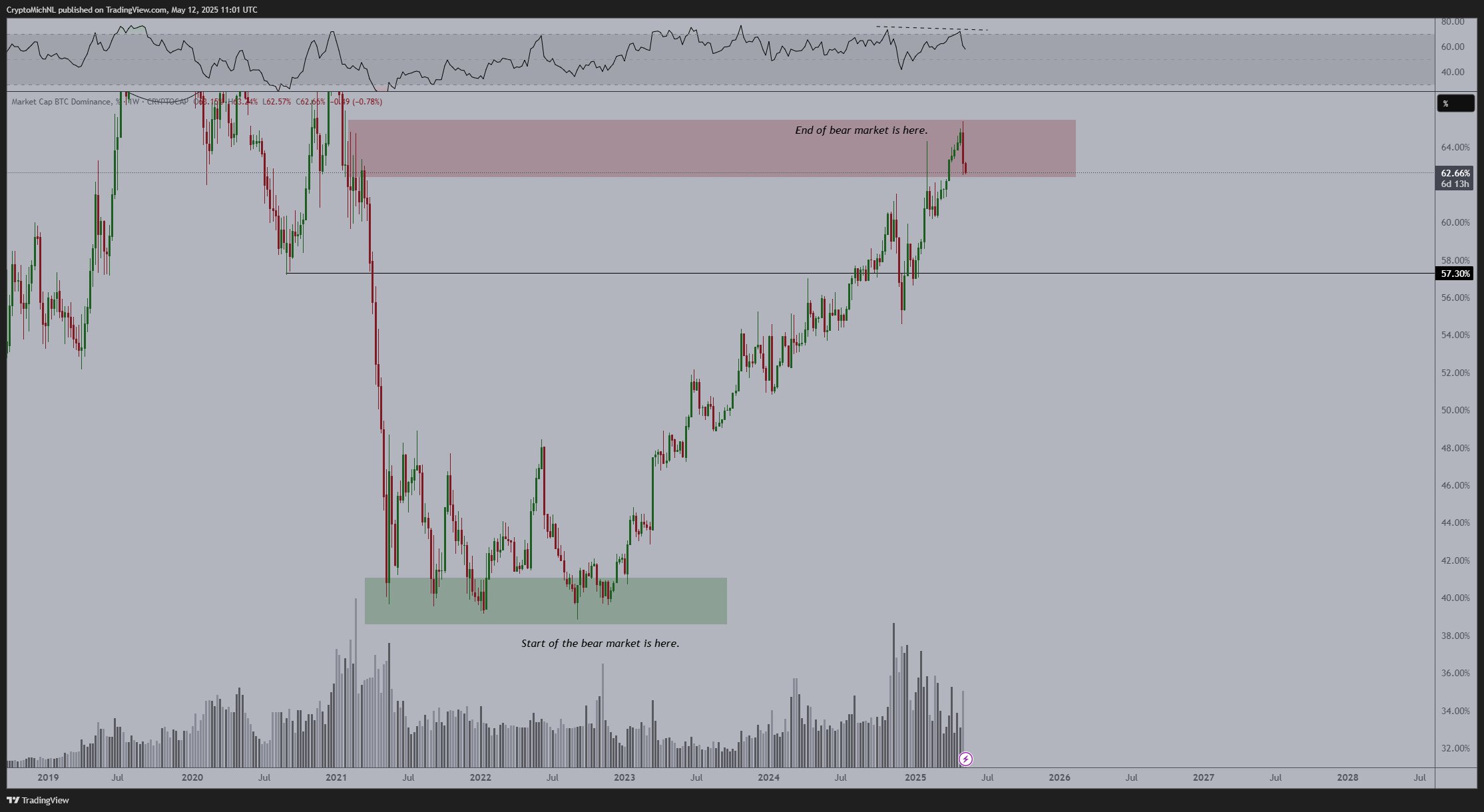 “Strong bearish divergence on the weekly timeframe, indicating that the #Bitcoin dominance has peaked. The end of the bear market for #Altcoins.”
