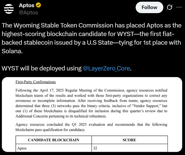 In addition to attracting large institutional issuers, Aptos has also drawn the attention of the US state of Wyoming, which has shortlisted the blockchain for its stablecoin pilot program.