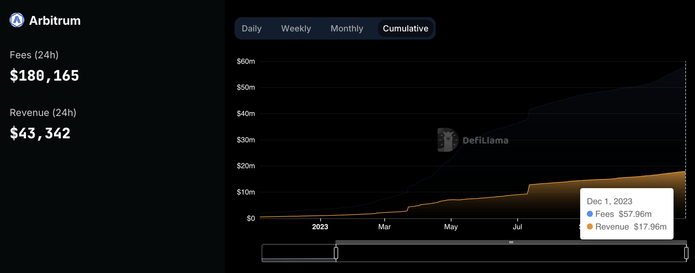 DefiLlama data shows that Arbitrum generated over $180,165 in fees and $43,342 in revenue just on Dec. 1. In November, its fees totaled $5.93 million, while its revenue reached $1.47 million.