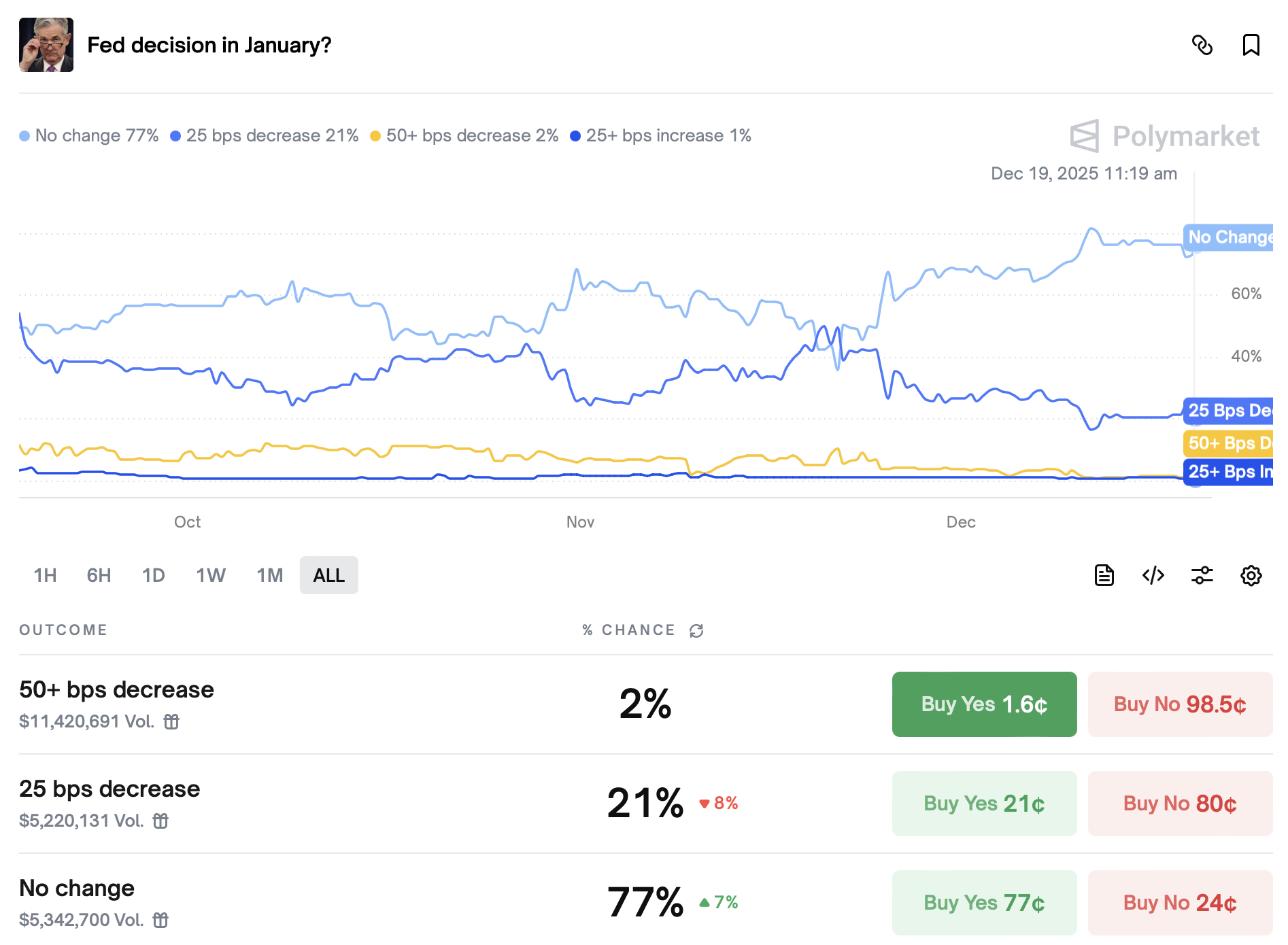 At the time of writing, Polymarket traders were overwhelmingly pricing in no change to Fed policy in January, with the probability of rates staying unchanged at about 77%, while odds of another 25 basis point cut sit near 21% and larger moves are viewed as highly unlikely.