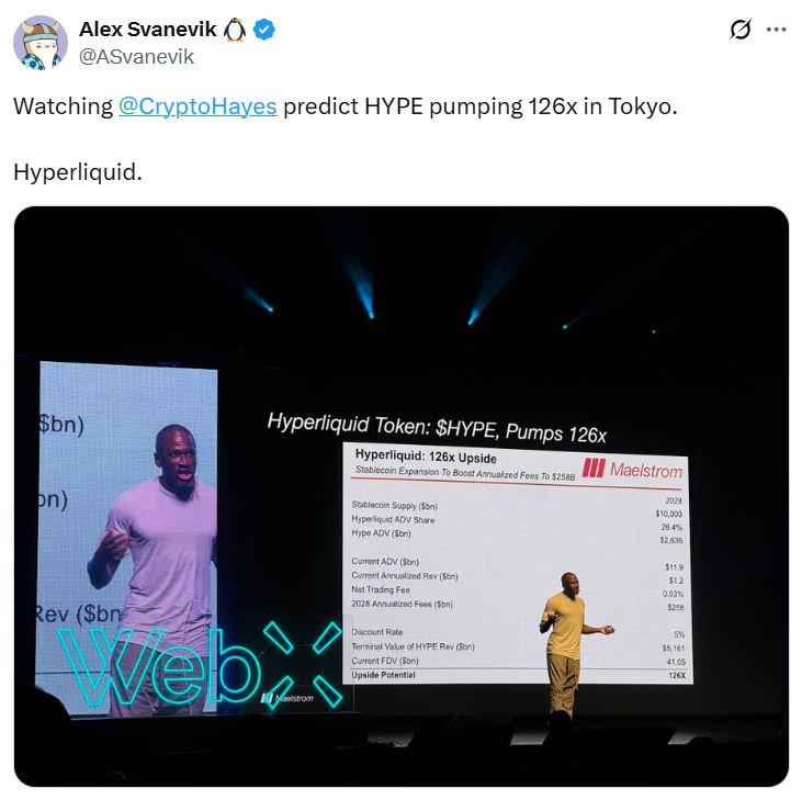During the WebX 2025 conference in Tokyo, Hayes forecast HYPE’s price to surge 126x over the next three years.
