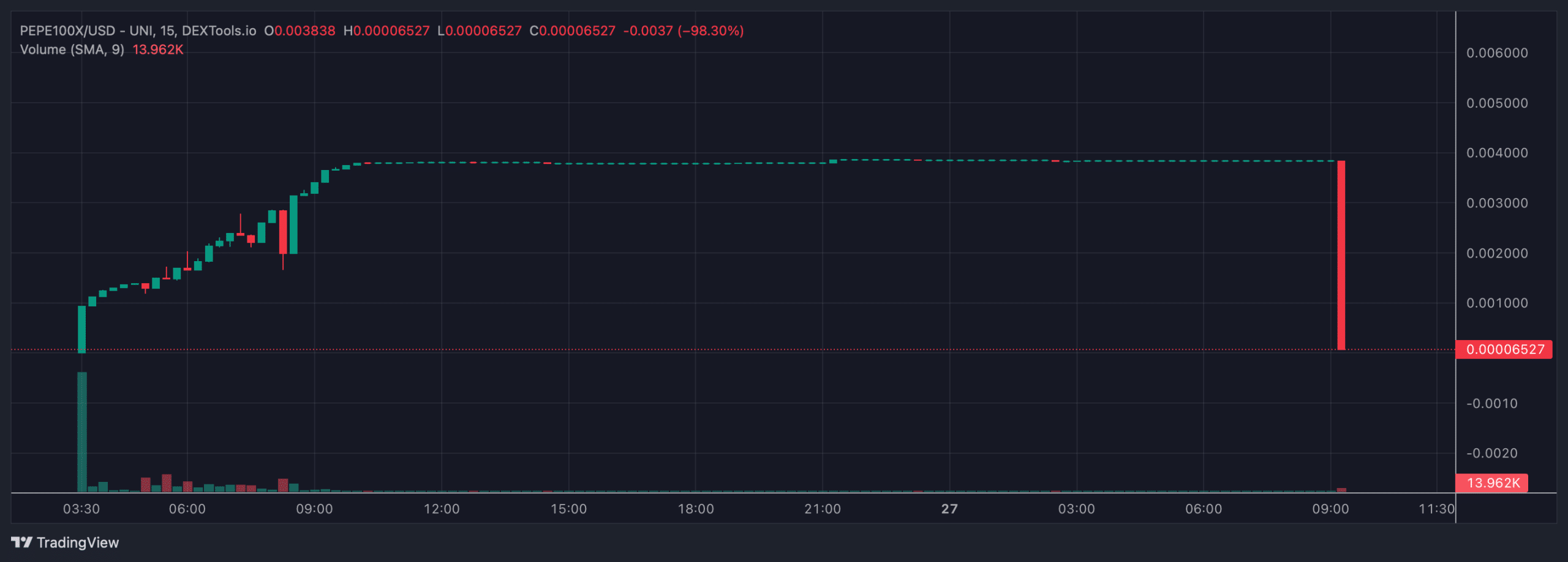 Indeed, with only 304 holders (as of writing) and a daily volume of approx. $15,330, it’s pretty clear that PEPE100’s sole function was to extract wealth from the unfortunate traders who thought they could somehow beat the coin’s issuer(s).