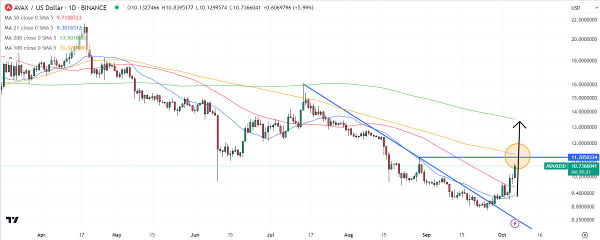 AVAX was last changing hands close to $10.70 per token, having broken convincingly to the north of both its 21 and 50-Day Moving Averages this week.