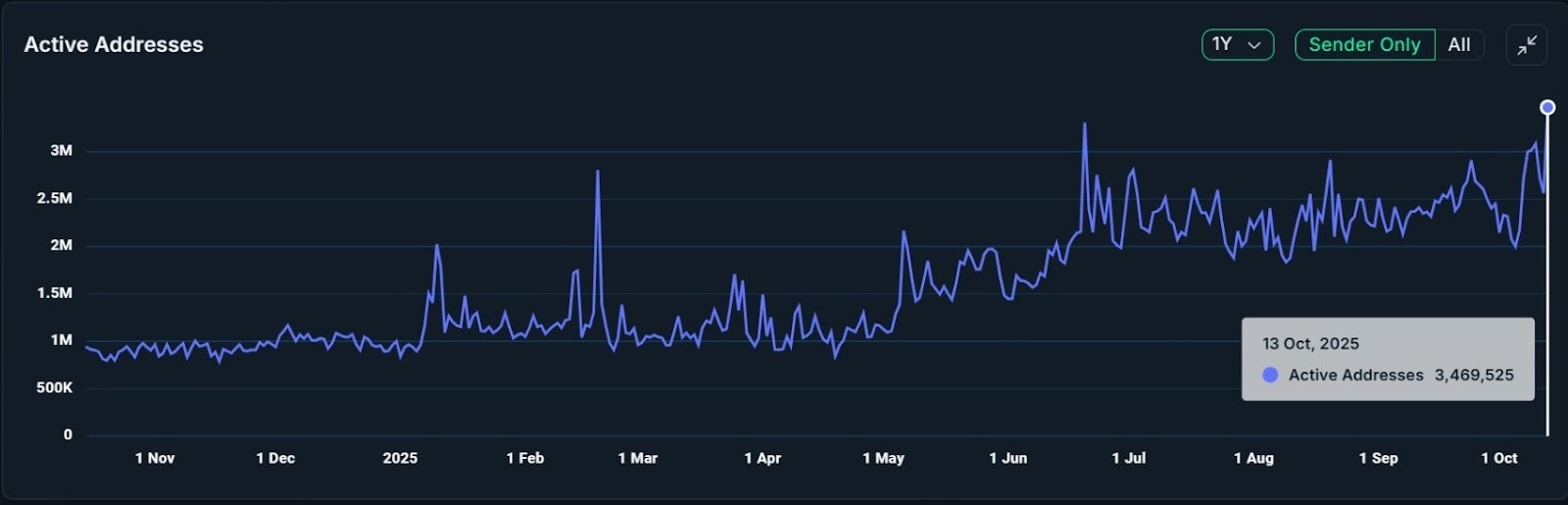 According to Nansen, sender-only active addresses on the blockchain reached a record 3.46 million on Monday, surpassing its previous high of 3.44 million in December 2023.