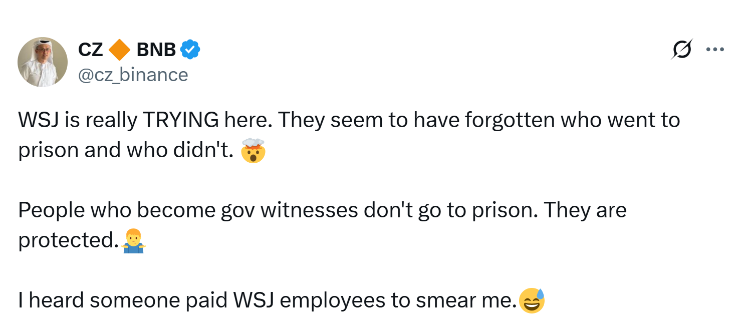 “WSJ is really TRYING here. They seem to have forgotten who went to prison and who didn’t,” Zhao wrote in an April 12 X post. “People who become gov witnesses don’t go to prison. They are protected. I heard someone paid WSJ employees to smear me.”