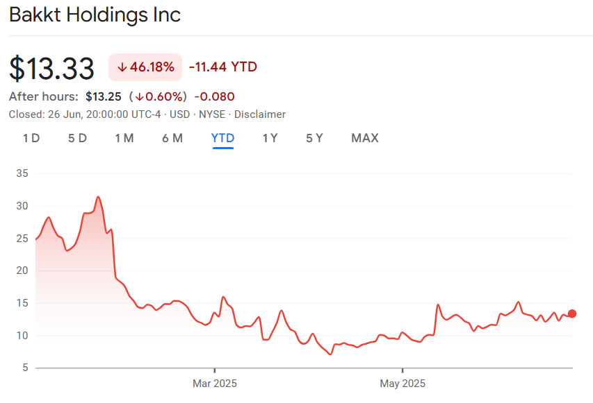 The NYSE-listed Bakkt saw its share price rise 3% on Thursday to reach $13.33, according to Google Finance. However, the stock is down 46% since the start of the year.