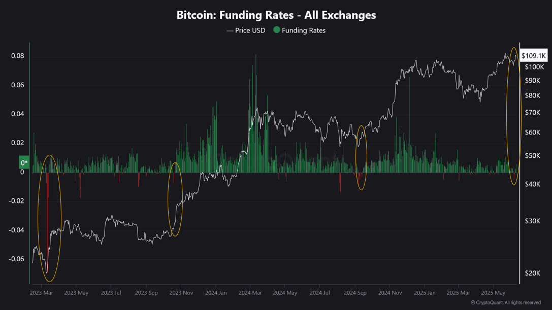 This rare pattern has appeared three times during this cycle, each followed by a significant price surge. A fourth instance may have occurred recently: between June 6–8, funding rates turned negative while BTC shot to $110,000 from $104,000.
