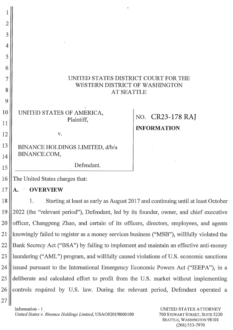 The government filed indictments against Binance and Zhao in Washington state on Nov. 14. The documents were unsealed on Nov. 21. Zhao steps away from Binance as part of the deal.