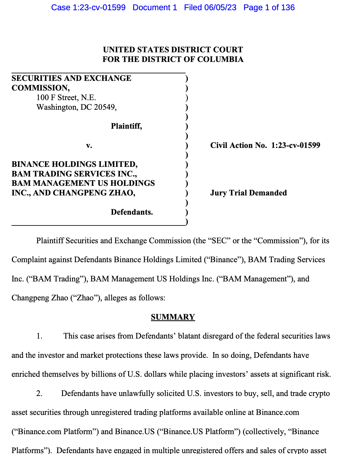The Securities and Exchange Commission filed suit against Binance, Binance.US and Zhao on June 5 with 13 charges, including unregistered securities sales, allowing U.S. customers to use the Binance exchange, intermingling customer and corporate funds and wash sales.