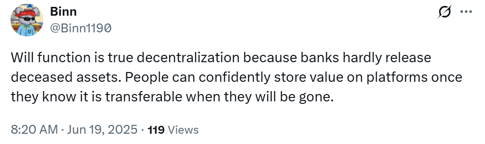 Others echoed the need for proper inheritance planning in Web3. X user Ghazi called it “a reality we can’t ignore,” while Binn praised the update as a step toward true decentralization, saying users will feel more secure knowing their digital wealth can be passed on.