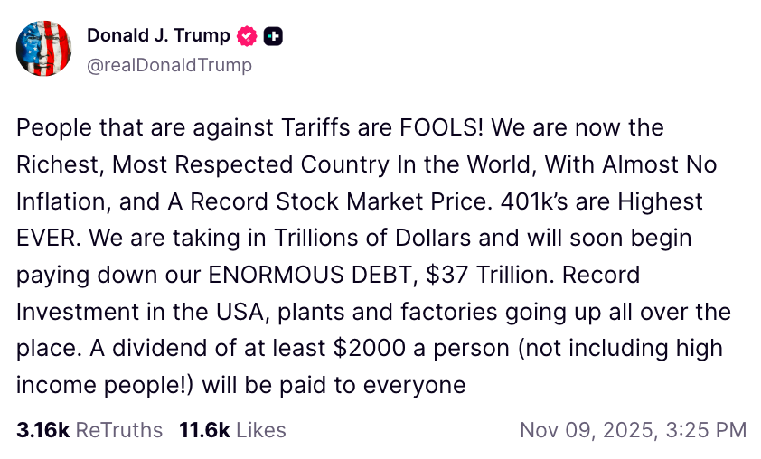 Tied to Trump’s international trade tariffs, the payout was revealed in a post on Truth Social.