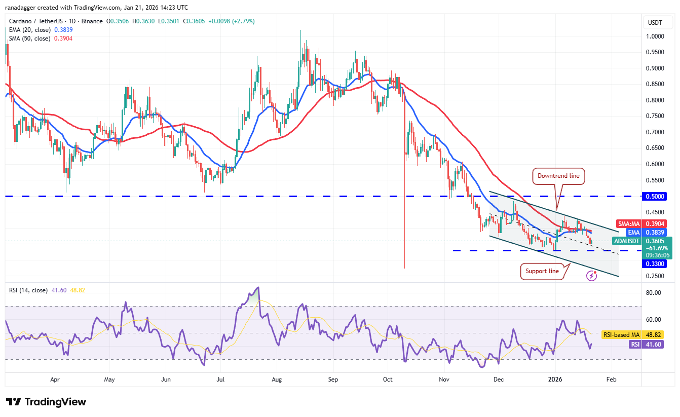 Cardano (ADA) is attempting to take support near the $0.33 level, but the recovery is expected to face selling in the zone between the moving averages and the downtrend line.