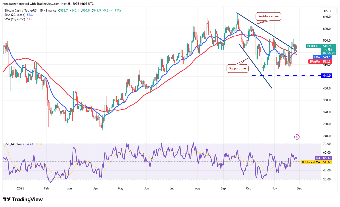 The 20-day EMA ($523) has started to turn up, and the RSI is just above the midpoint, indicating a slight advantage to the buyers. The bulls will have to propel the Bitcoin Cash price above $568 to start a new up move to $580 and then to $606.