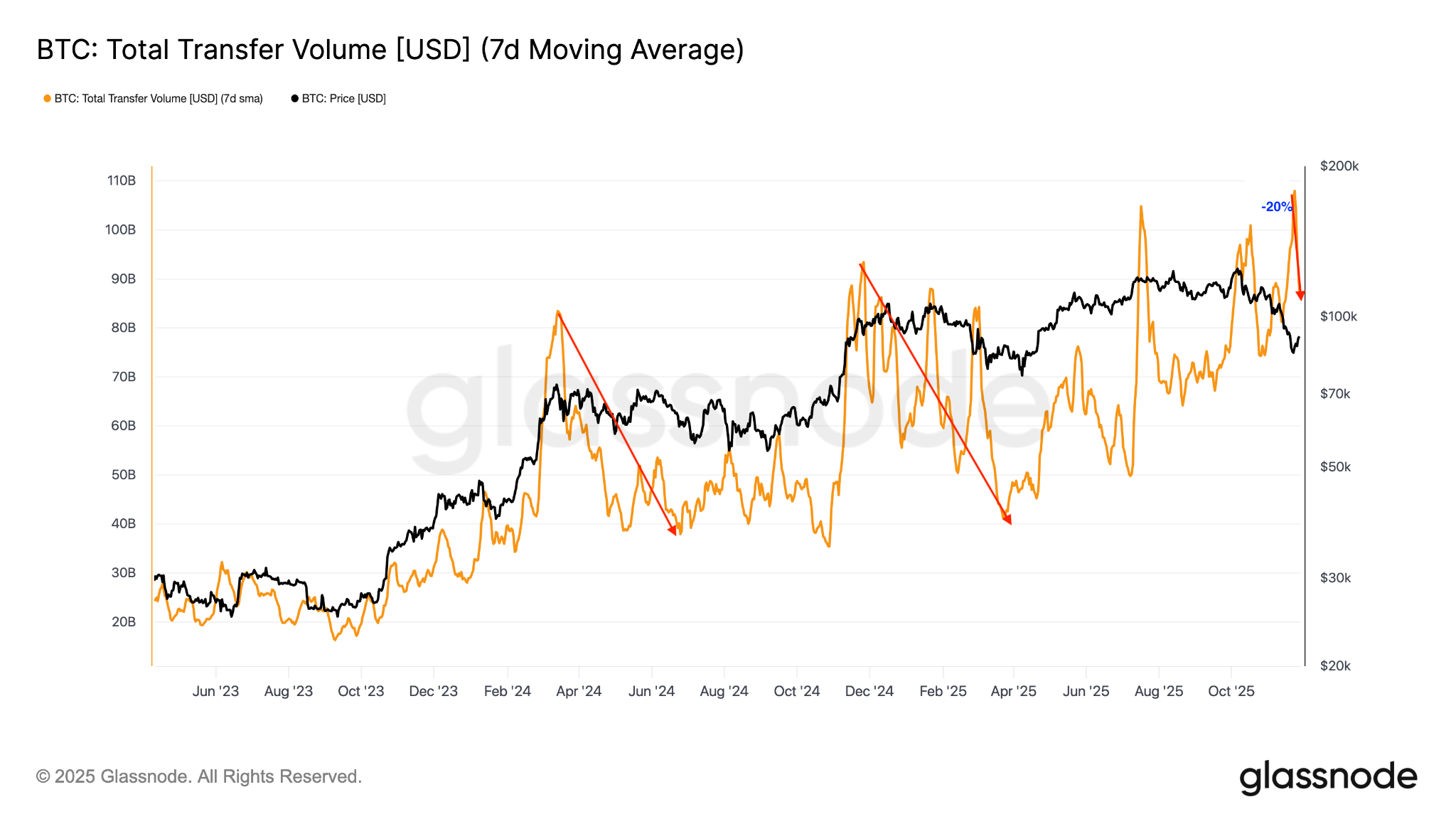 The seven-day moving average of onchain transfer volume has dropped by approximately 20% to $87 billion over the last week.