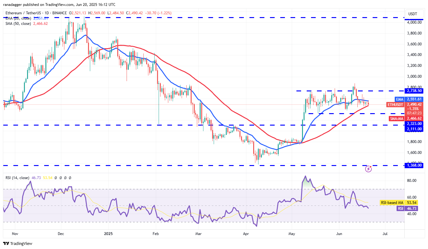Ether (ETH) is getting squeezed between the 20-day EMA ($2,551) and the 50-day SMA ($2,466), indicating uncertainty between the buyers and sellers.