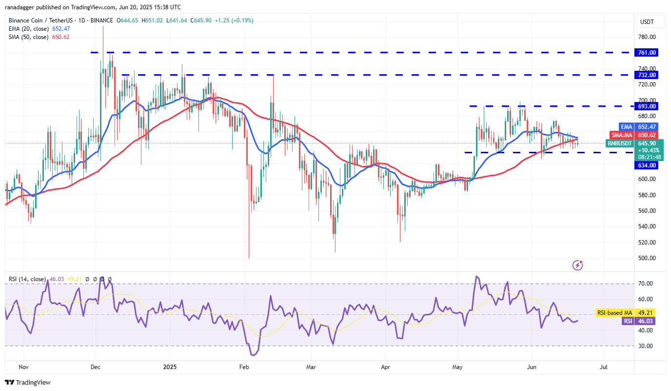 BNB (BNB) is getting squeezed between the 20-day EMA ($652) and the horizontal support at $634, suggesting an imminent breakout in the near term.
