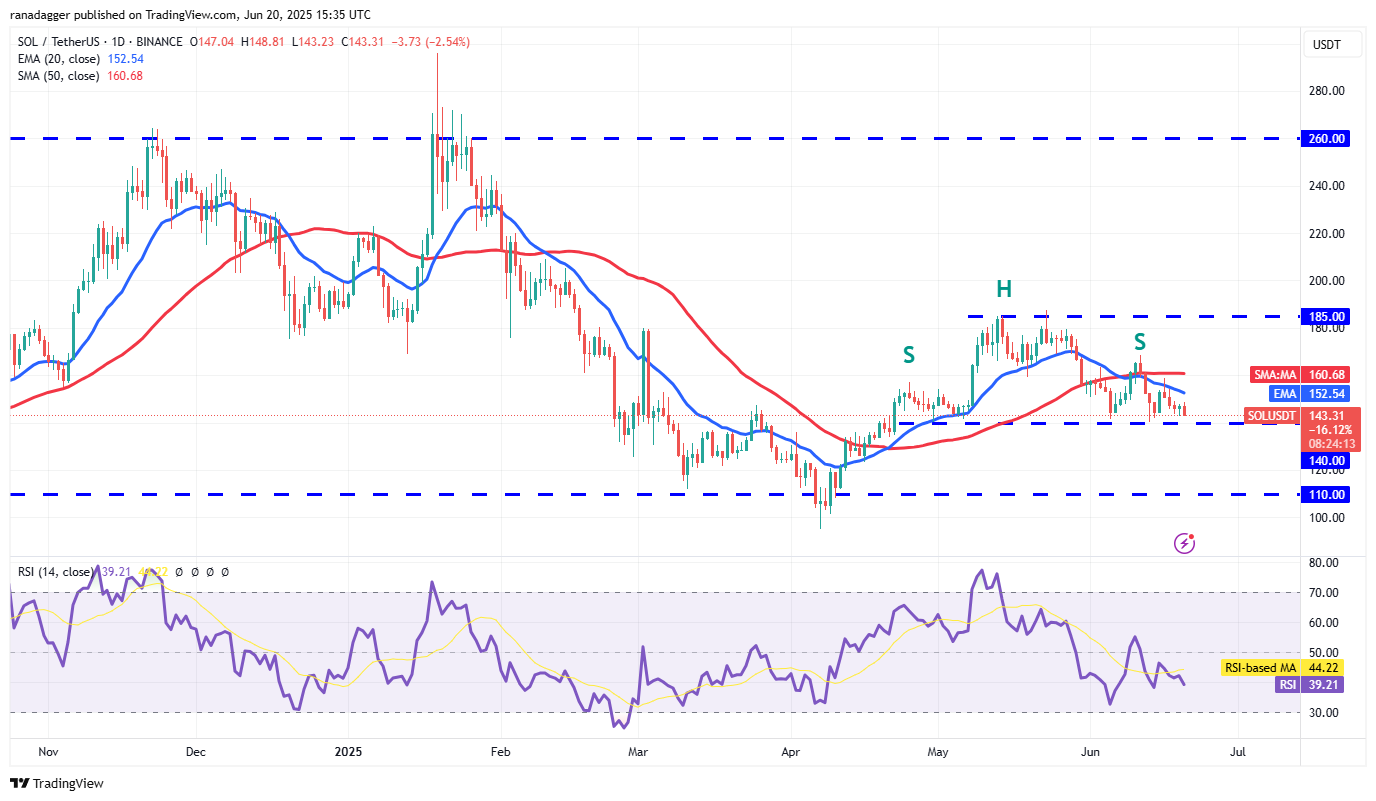 Buyers have kept Solana (SOL) above the $140 support but are struggling to clear the hurdle at the 20-day EMA ($152).