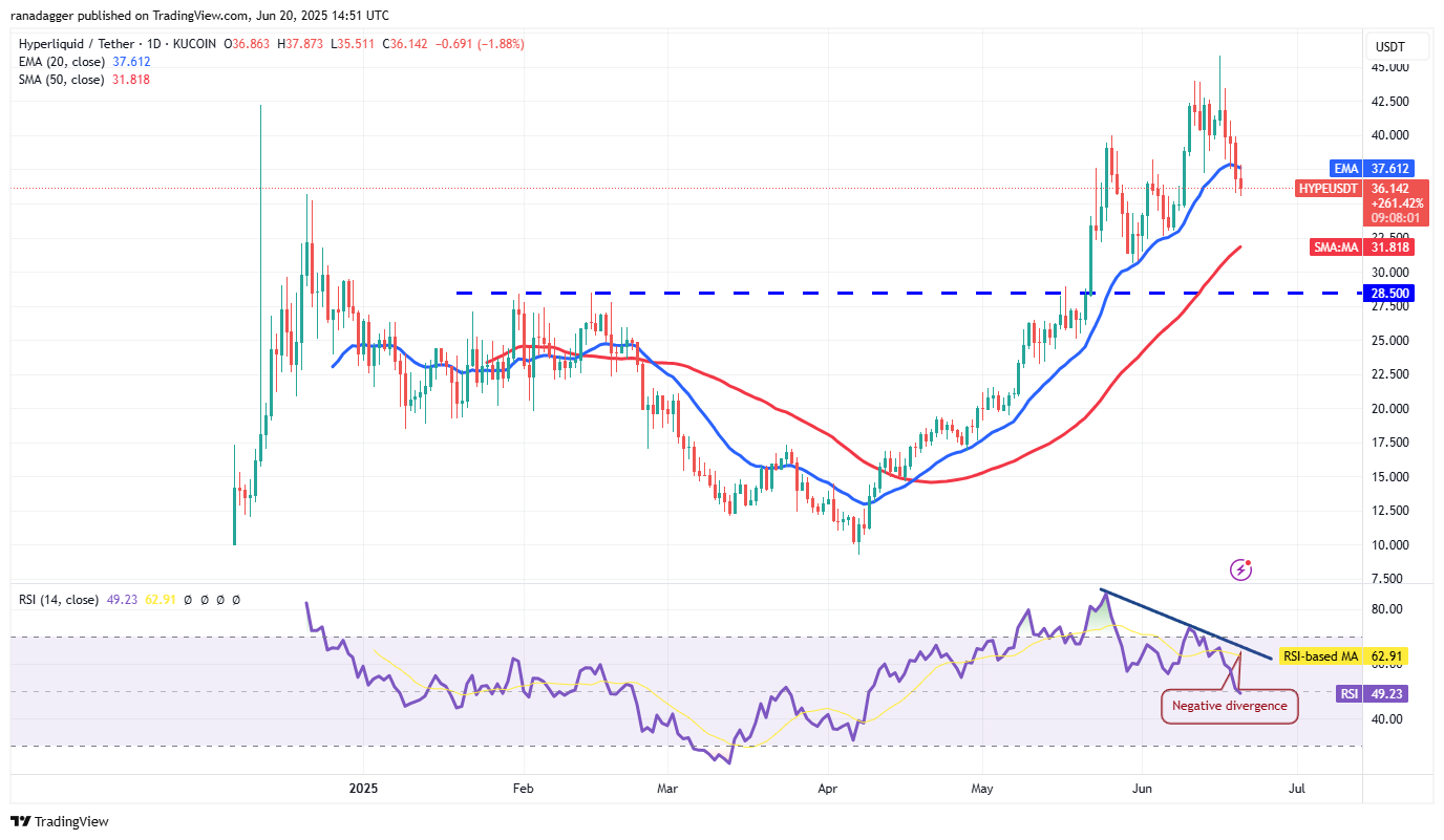 Hyperliquid (HYPE) turned down and broke below the 20-day EMA ($37.61) on Thursday, suggesting profit-booking by the short-term bulls.