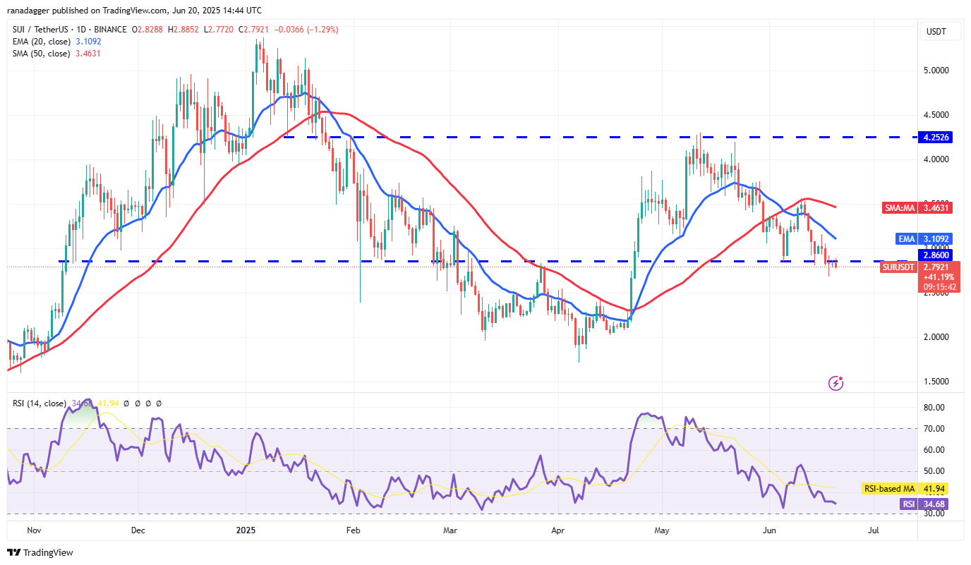 Sui (SUI) has been trading below the $2.86 support since Tuesday, signaling that the bears have kept up the pressure.
