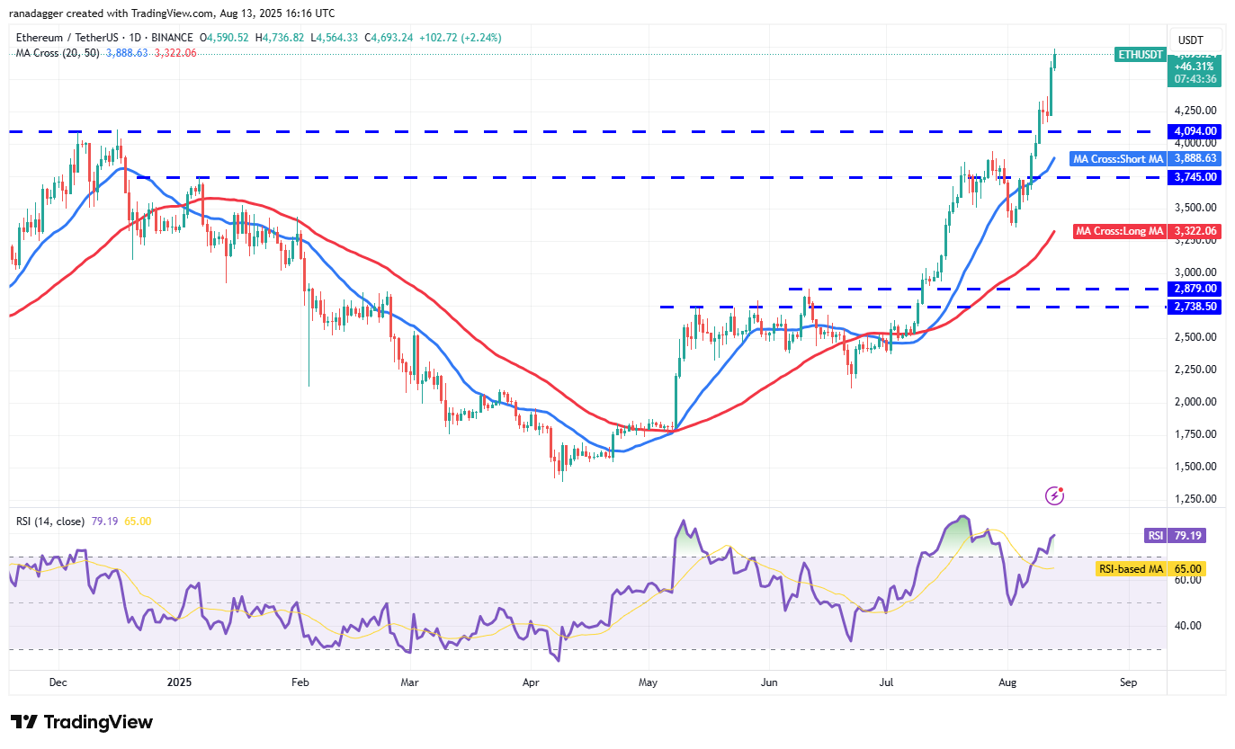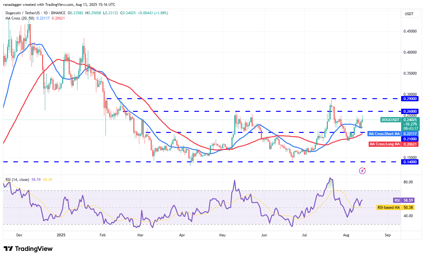 The flattish 20-day simple moving average ($116,957) signals a balance between supply and demand, but the relative strength index (RSI) above 65 indicates positive momentum. That increases the likelihood of a break above $123,218. The BTC/USDT pair could then surge toward $135,000.