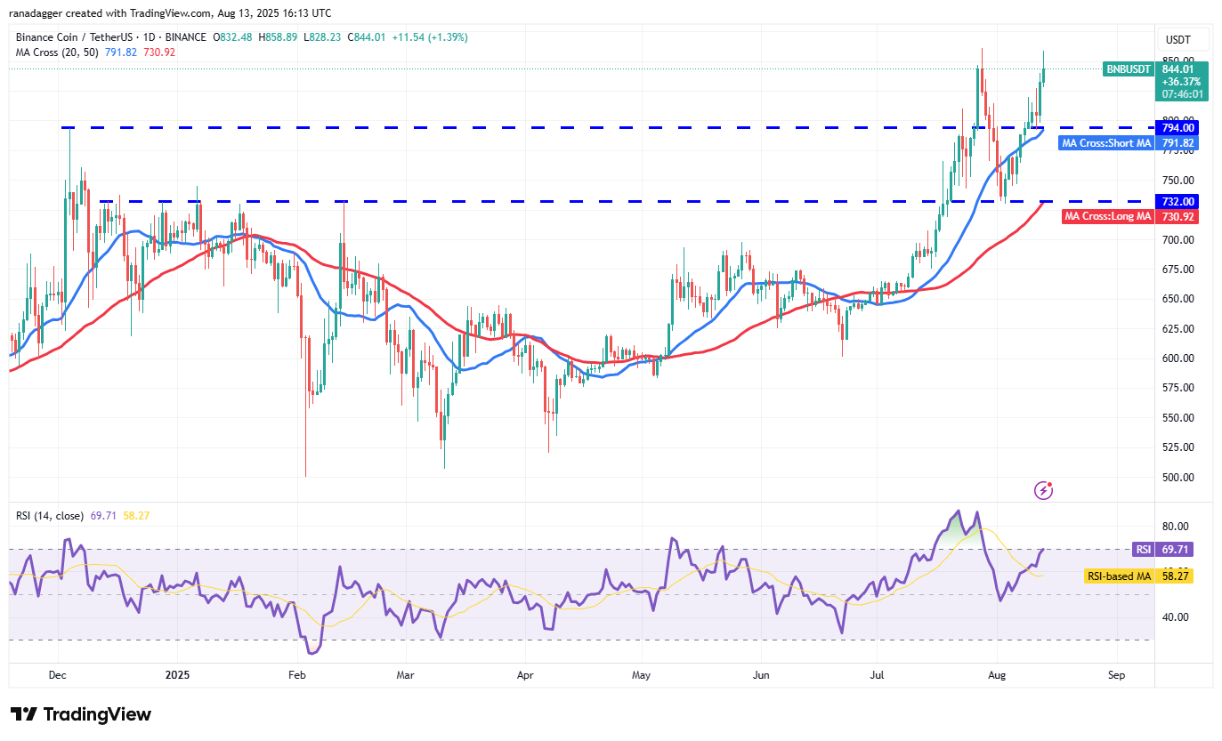 The BNB/USDT pair rallied close to the $861 overhead resistance, where the bears are posing a strong challenge. If the price turns down from $861, but rebounds off the 20-day SMA ($794), it suggests that dips are being purchased. That enhances the prospects of a break above $861. The BNB price may then ascend to $900 and later to $1,000.